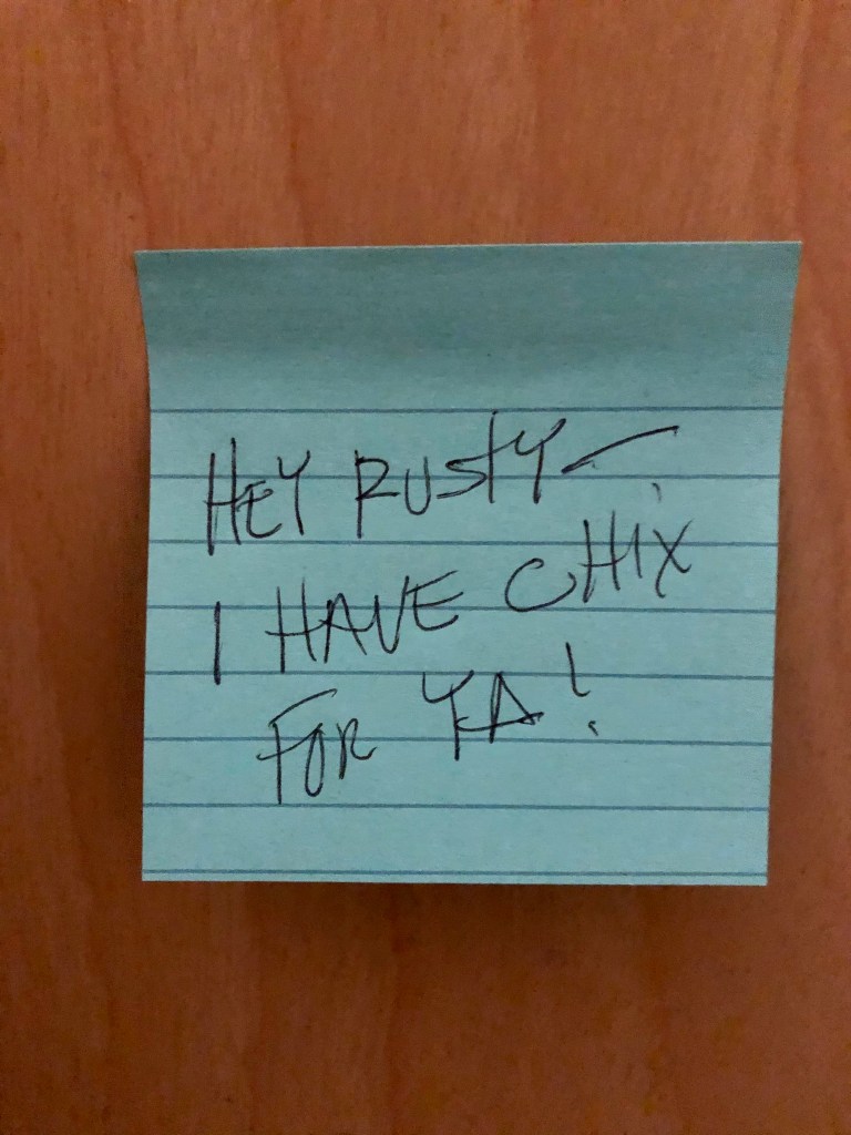 Placed awkwardly low because duh, it wasn’t a note for me. It was, of course, for Rusty.